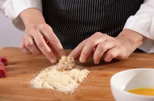 1. Prepare the breading by placing the chunks in the flour, then the eggs, and lastly in the breadcrumbs with almond nibs.